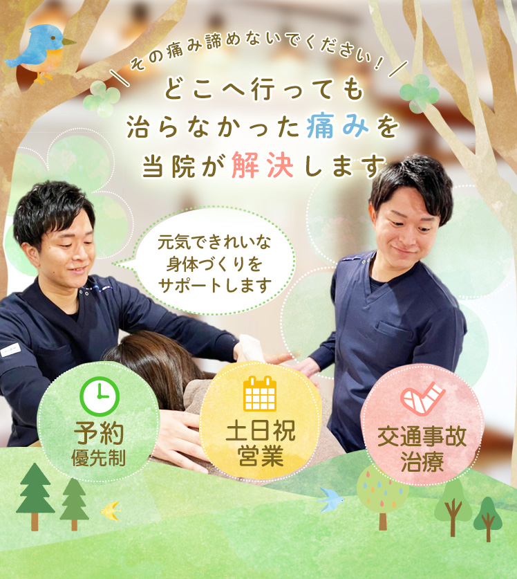 事故の遭われた方が将来的にも困られないように、できるだけ早く交通事故に遭う前よりもいい状態にまでお身体を戻させていただく気持で、ひとりひとりの状態に合わせた治療を行っています。
